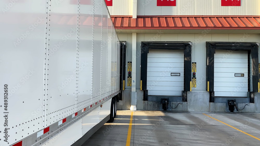 Obraz na plátně Long, 53 ft semi trailer parked at shipping warehouse docks to pick up or deliver a load