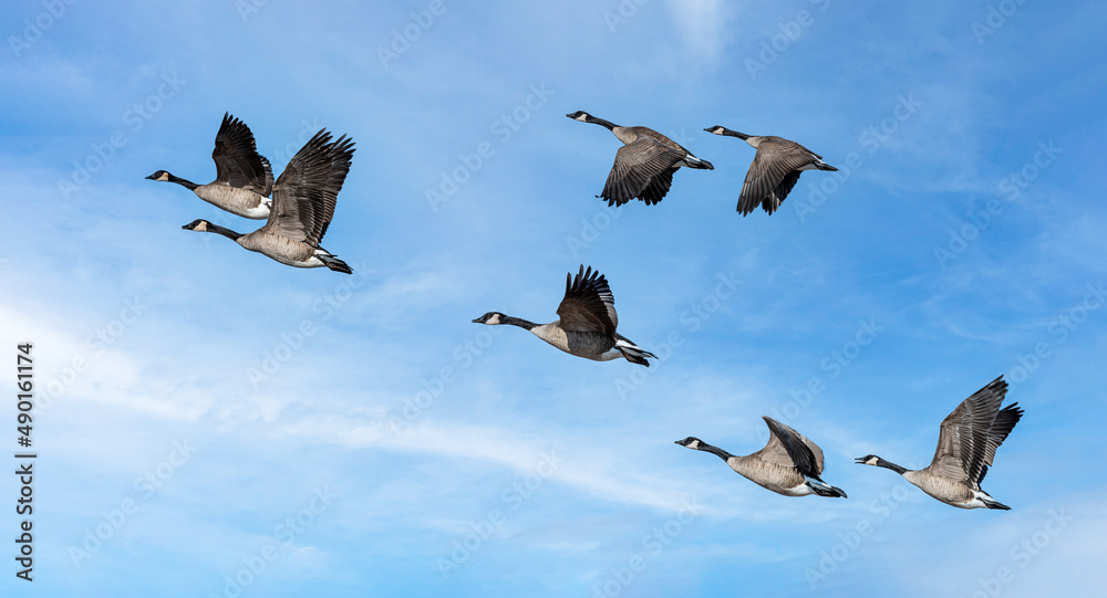 Obraz na plátně Flock of Canada geese flying in a cloudy sky