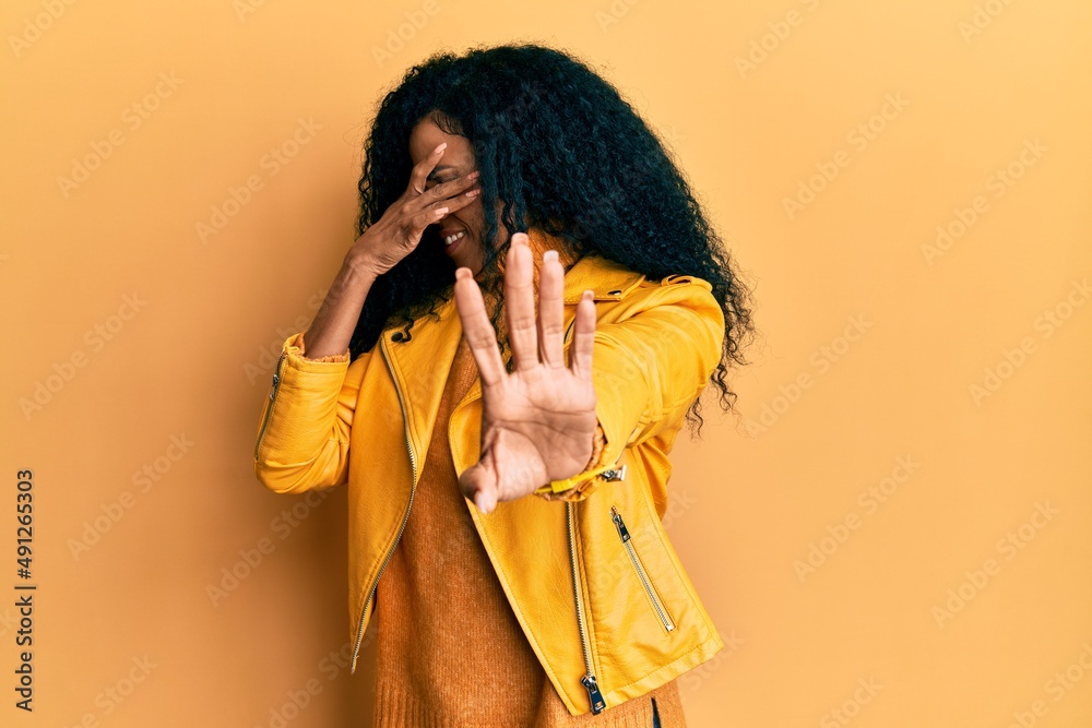 Obraz na plátně Middle age african american woman wearing wool winter sweater and leather jacket covering eyes with hands and doing stop gesture with sad and fear expression