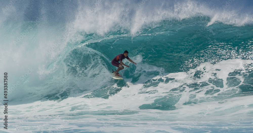 Obraz na plátně Surfer surfing big tropical wave barrel tube at Banzai Pipeline in Hawaii