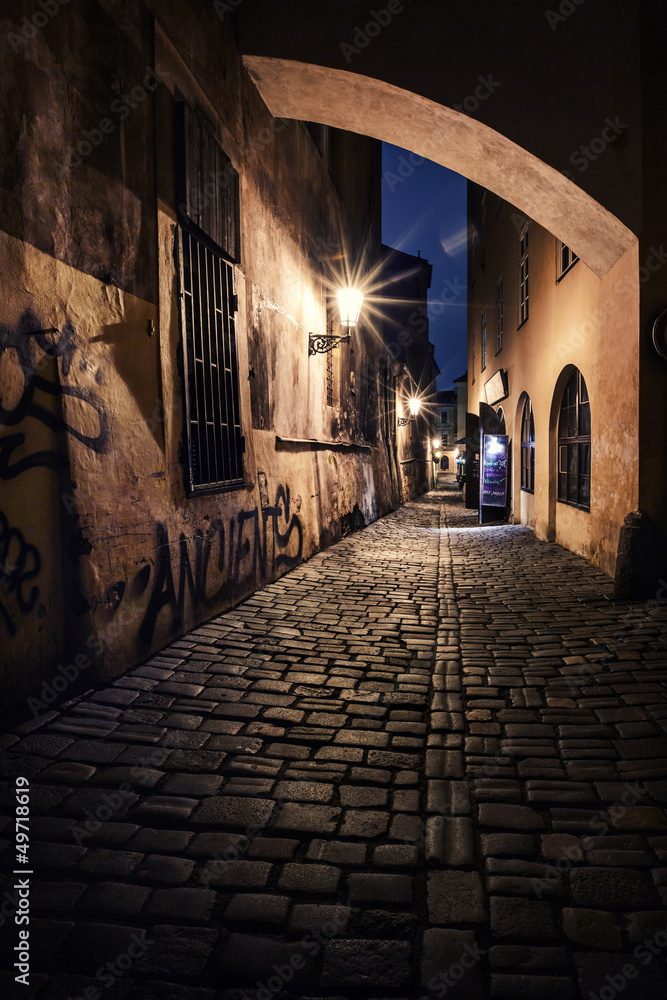 Obraz na plátně narrow alley with lanterns in Prague at night