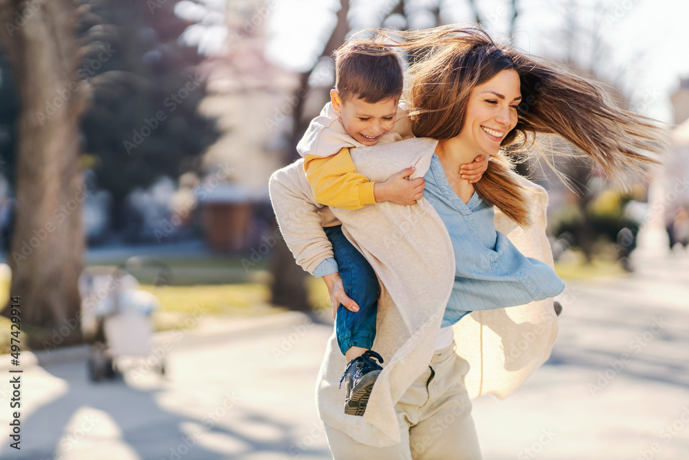 Obraz na plátně A mother and son having fun, spinning, having piggyback ride in a park