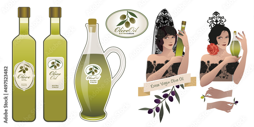 Obraz na plátně Spanish woman dressed in typical clothing holding bottles of olive oil