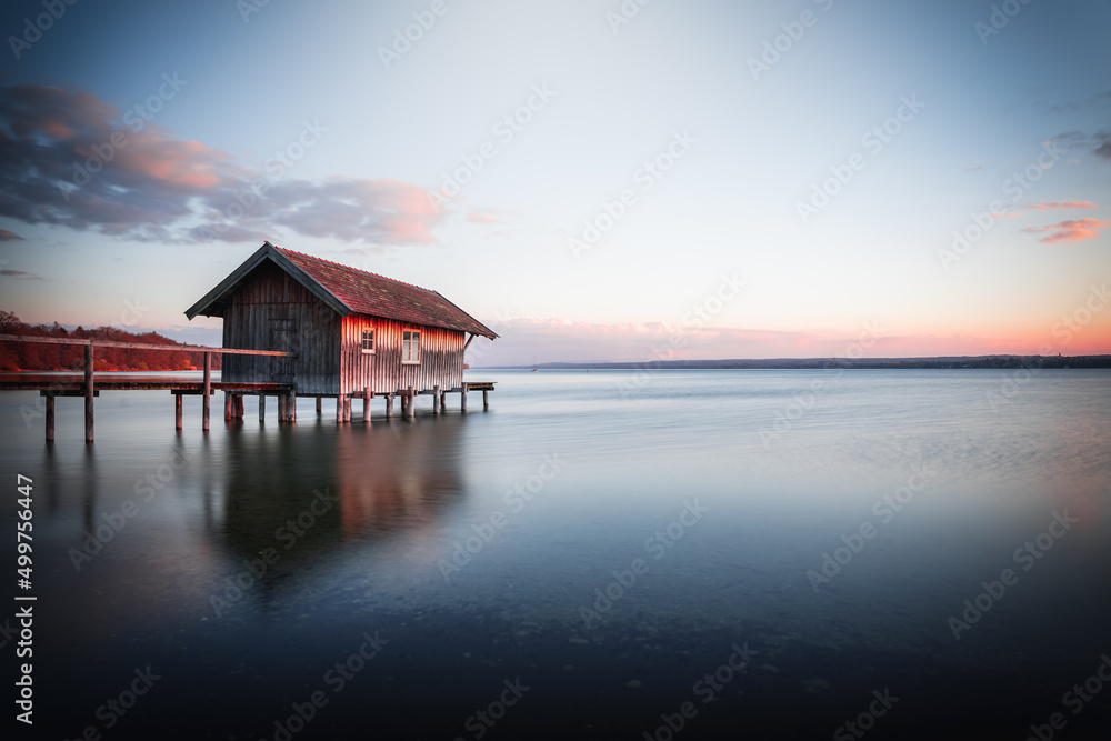 Obraz na plátně Traditional boathouse at lake Ammersee near Munich, Bavaria, Germany at sunrise