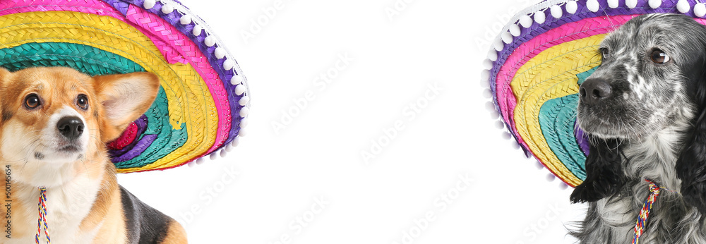 Obraz na plátně Cute Mexican dogs in sombrero hats on white background with space for text