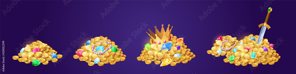 Obraz na plátně Gold coins heaps with gems and jewelry