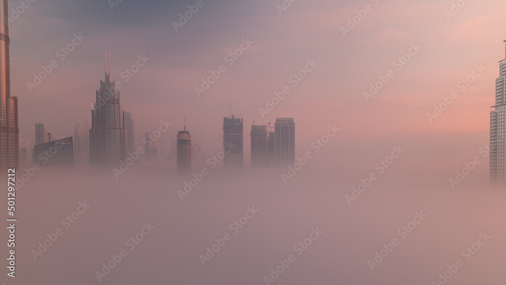 Obraz na plátně Aerial view morning fog covered Dubai International Financial Centre district ti