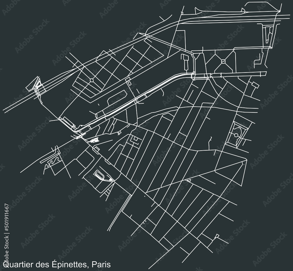 Obraz na plátně Detailed negative navigation white lines urban street roads map of the ÉPINETTES