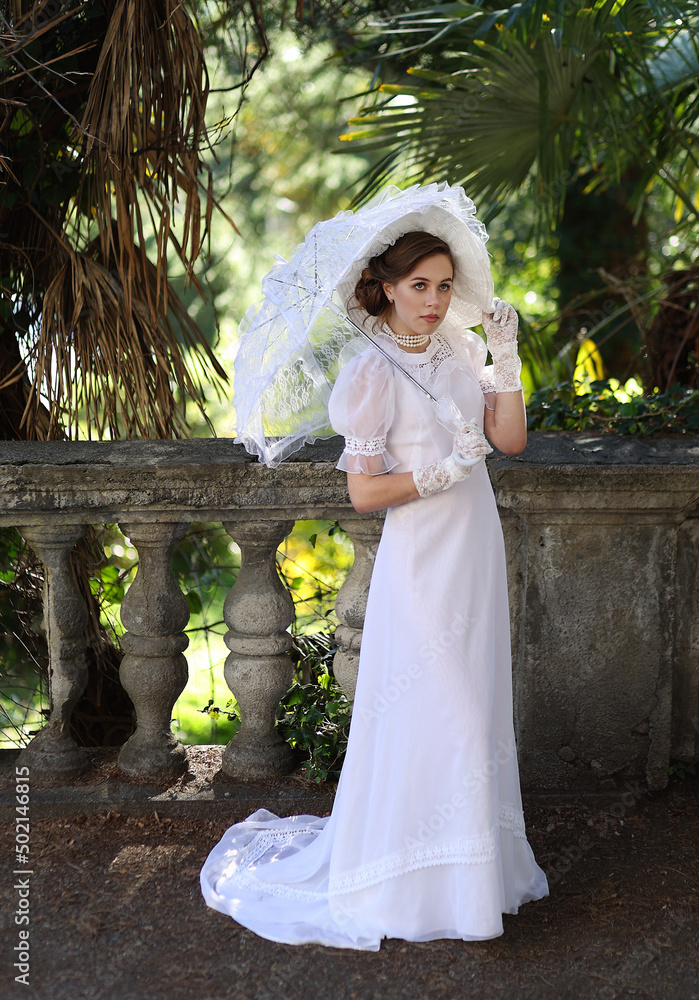 Obraz na plátně Young woman in white edwardian style dress and white big hat standing in old abandoned castle