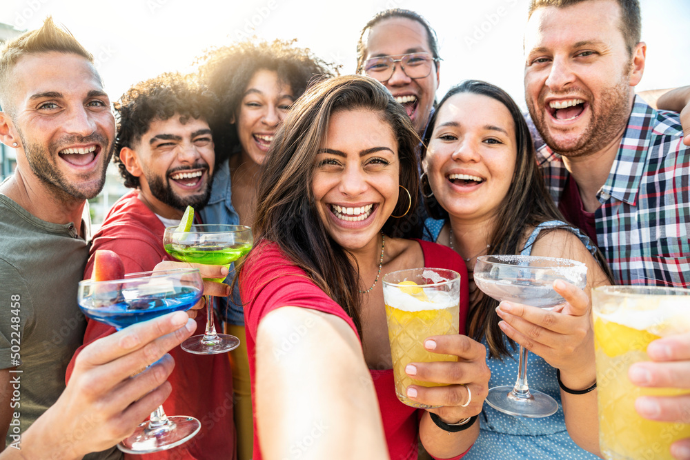 Obraz na plátně Multi-ethnic group of young people drinking cocktails outside at sunset - Happy