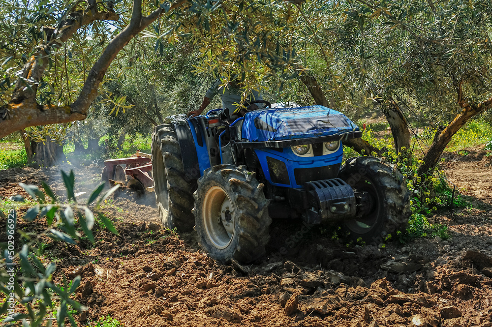 Obraz na plátně Tractor performing tillage tasks in the olive grove - disc harrows