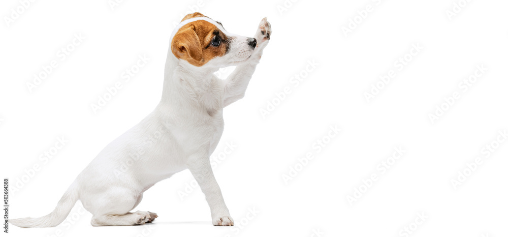 Obraz na plátně Portrait of cute puppy of Jack Russell Terrier rising paw up, following command