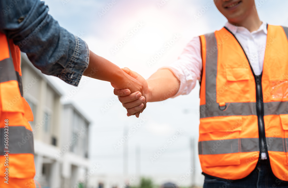Obraz na plátně Asian male civil engineer in safety vest shaking hands for agreement in housing