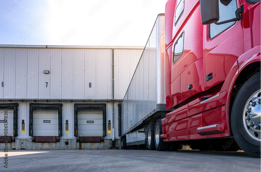 Obraz na plátně Red modern American semi truck parked at the docks, waiting to get loaded