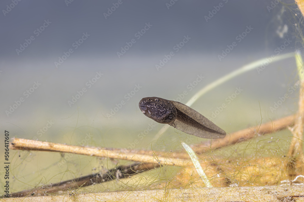 Obraz na plátně A young tadpole of the grass frog swims through the light shallow water in the p