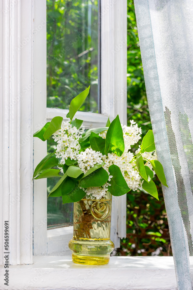 Obraz na plátně a bouquet of white lilac flowers in a glass vase on a white windowsill at an ope