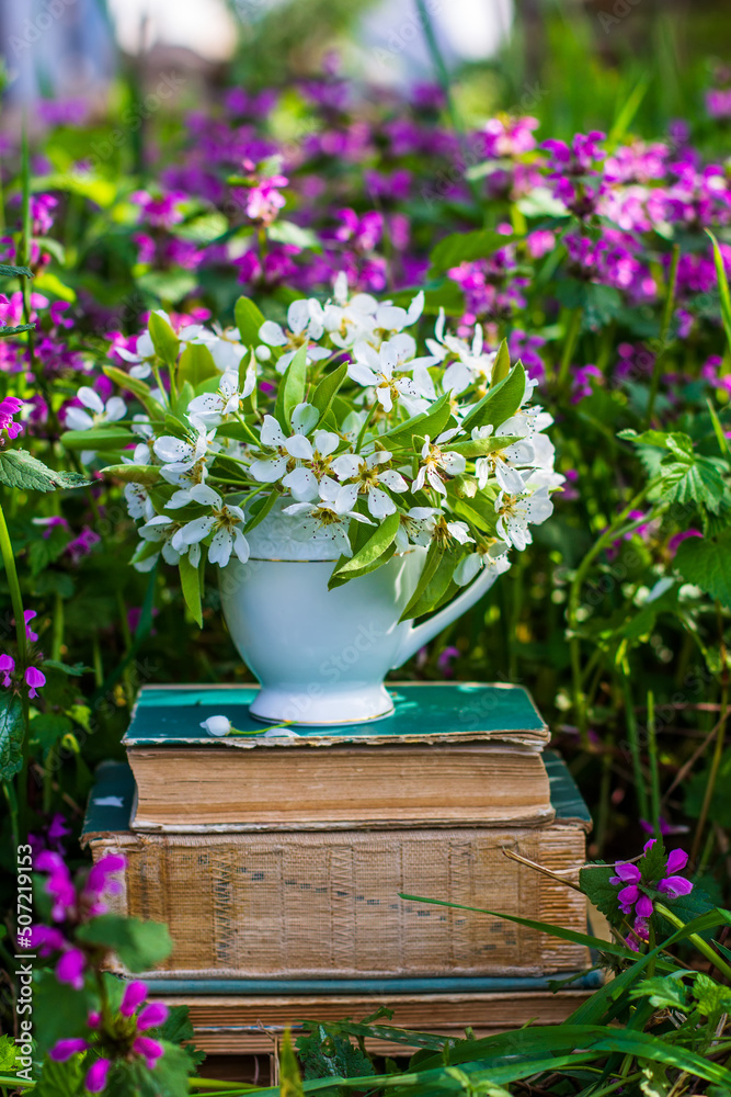 Obraz na plátně a white tea cup with a bouquet of fruit tree branches blooming with white flower