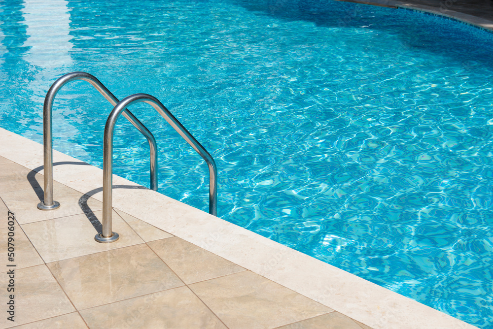 Obraz na plátně Clear turquoise water in the outdoor swimming pool and railings.