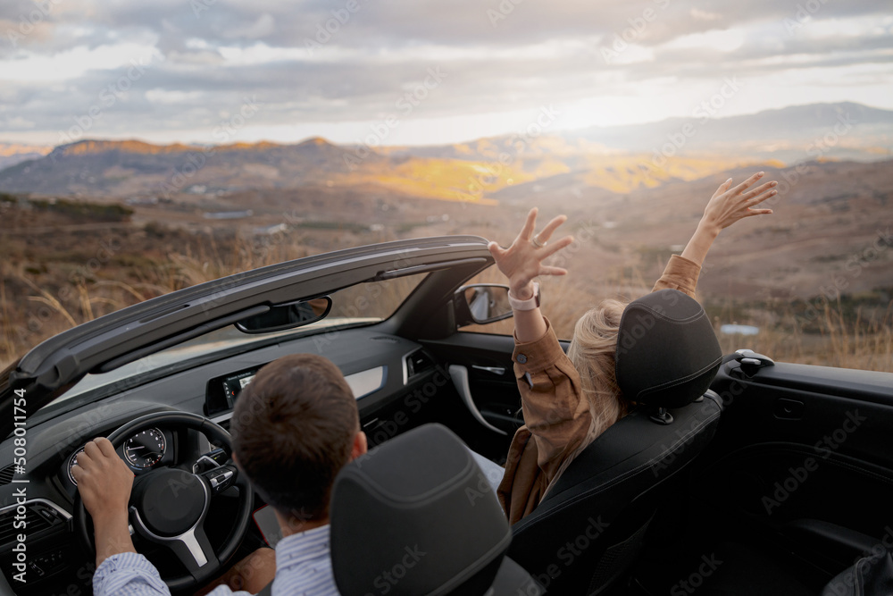Obraz na plátně Rear of couple man and woman traveling in convertible car by mountainside enjoyi