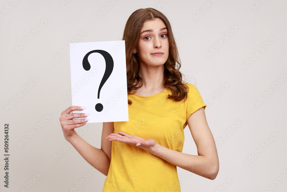 Obraz na plátně Young attractive brown haired young woman in yellow casual style T-shirt holding paper with question mark, making decision, solving problem