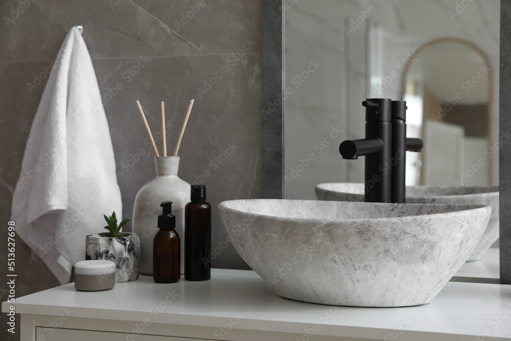 Obraz na plátně Stone vessel sink with faucet and toiletries on white countertop in bathroom