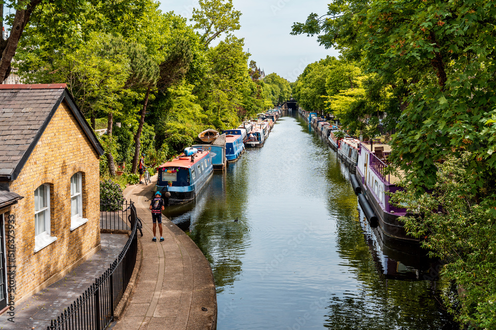 Obraz na plátně Colorful typical narrowboats moored along Little Venice basin, near the Paddington Basin