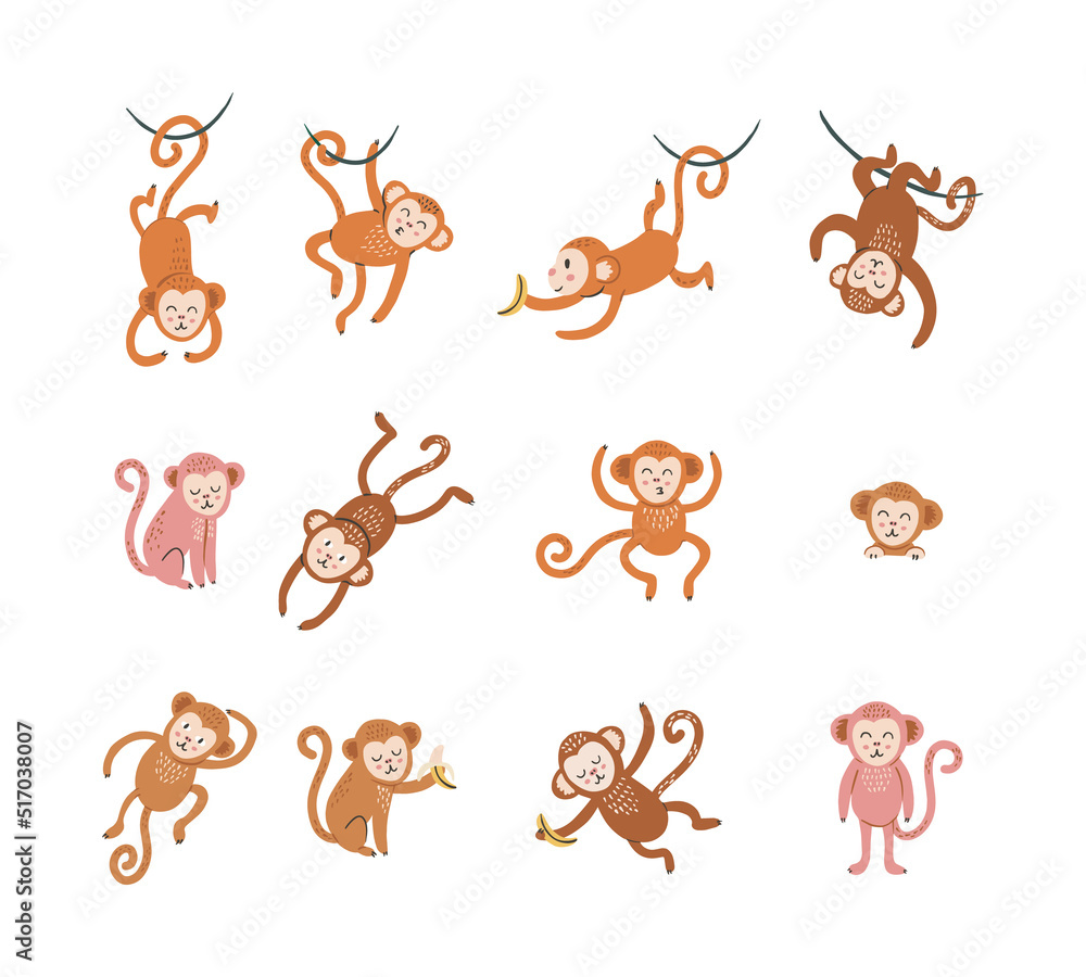 Obraz na plátně Set of cute monkey with funny face in different poses