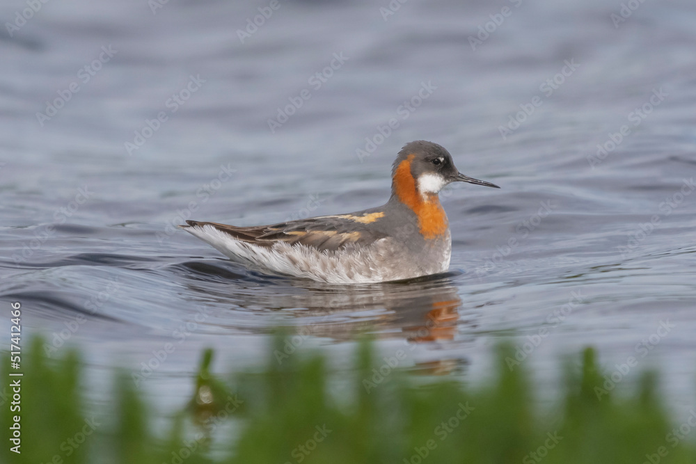 Obraz na plátně Red-necked phalarope, northern phalarope, hyperborean phalarope - Phalaropus lobatus, swimming in calm water with vegetation in background