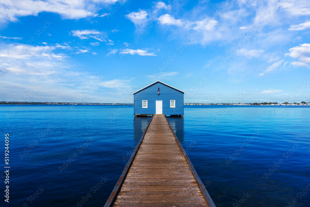 Obraz na plátně Charming blue boathouse at the end of a pier in Crawley, Western Australia