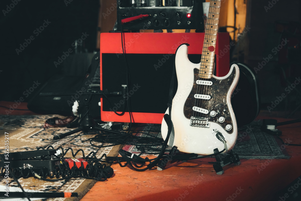 Obraz na plátně A white electric guitar and a red amplifier onstage with electrical audio cables