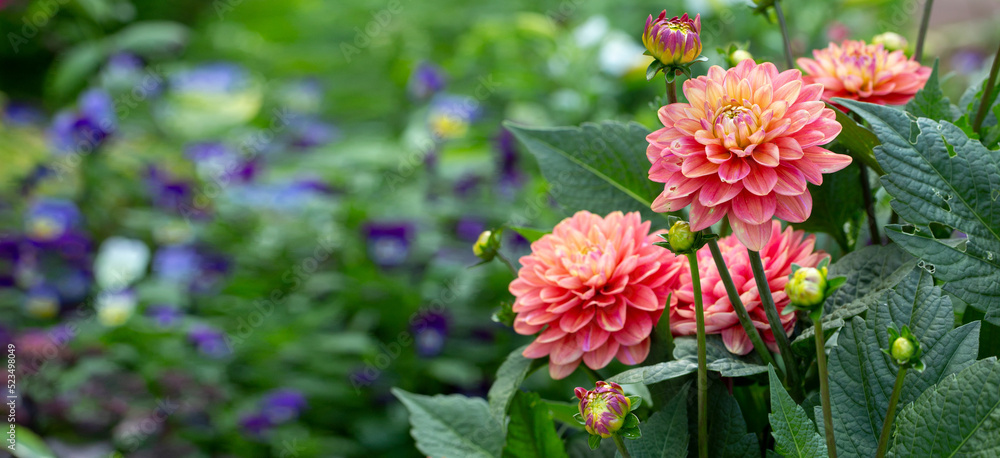 Obraz na plátně Lush pink dahlia flowers in a flower bed in summer