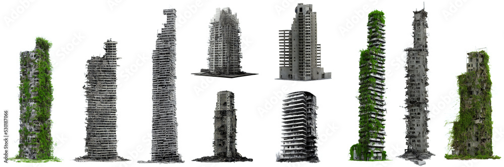 Obraz na plátně collection of ruined skyscrapers, tall overgrown post-apocalyptic buildings isol