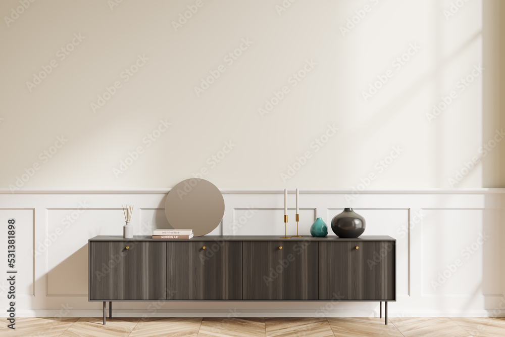 Obraz na plátně Light living room interior with wooden drawer and decoration