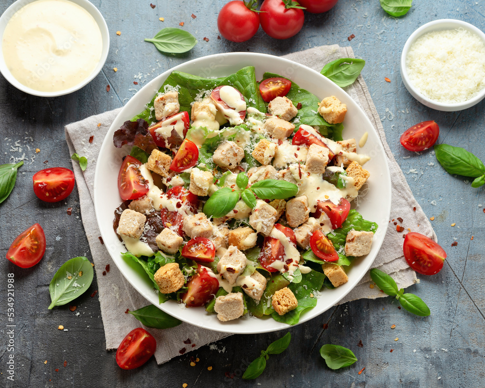 Obraz na plátně Vegetarian ceasar salad with meat free chicken pieces cherry tomatoes croutons and lettuce in white plate