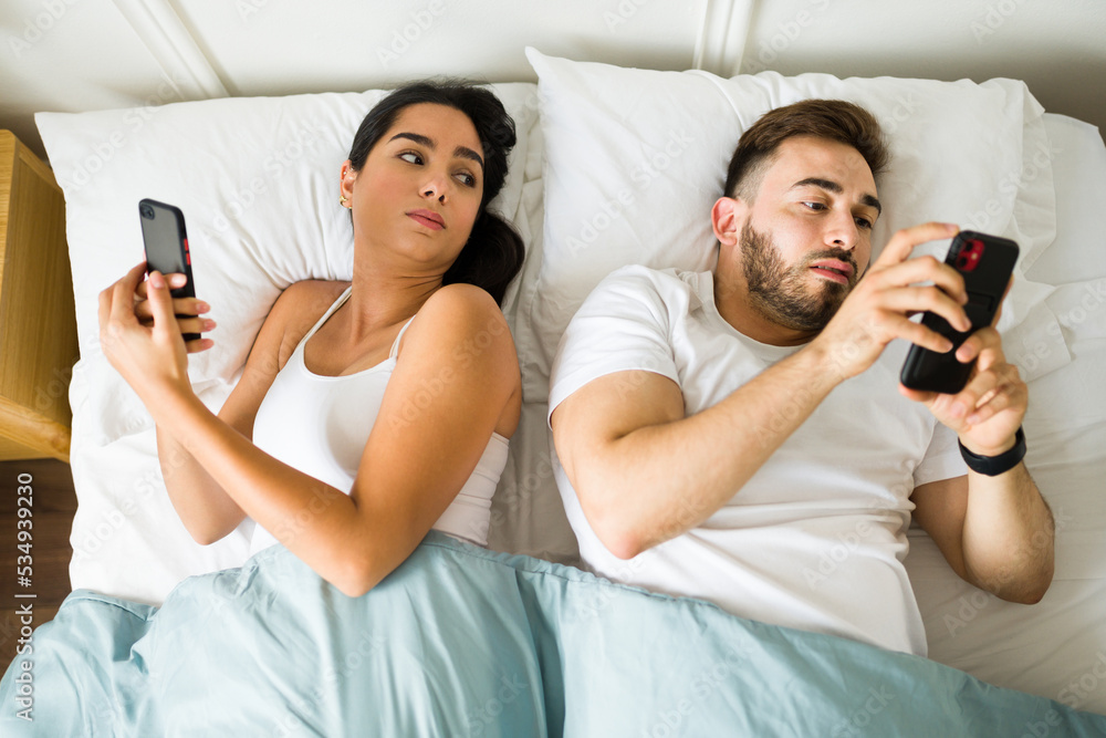 Obraz na plátně Girlfriend feeling jealous about his boyfriend texting on his phone