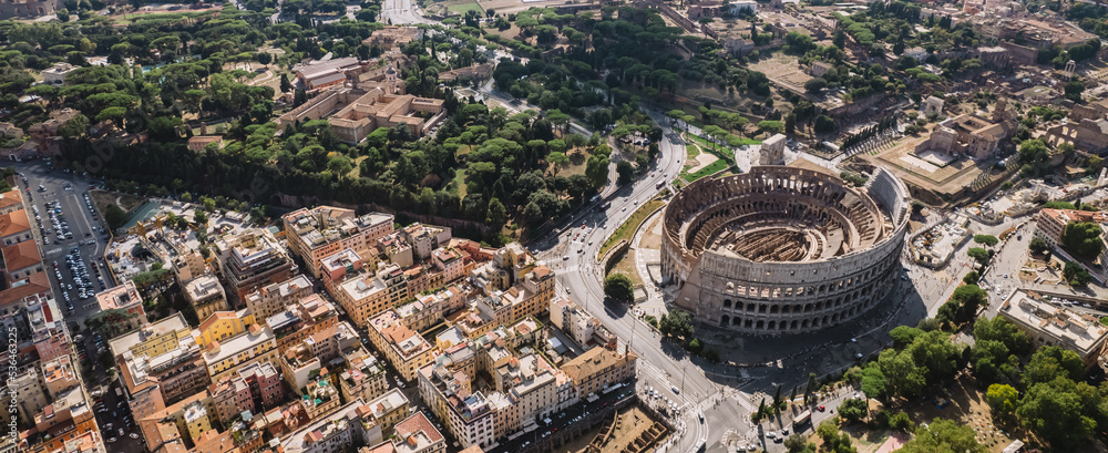 Obraz na plátně The Colosseum and the Imperial Forums in Rome beautiful aerial shot around the Colosseum