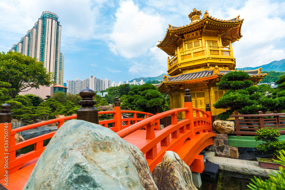 Obraz na plátně Oriental gold pavilion green tree and pond in Nan Lian garden