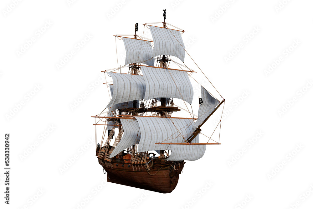 Obraz na plátně Front perspective 3D illustration of an old wooden pirate sailing ship isolated on a transparent background