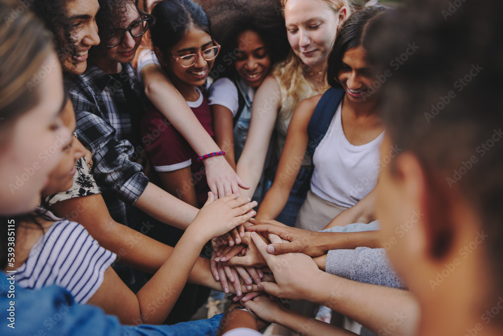 Obraz na plátně Diverse teenagers putting their hands together in unity