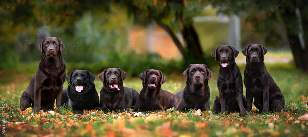 Obraz na plátně group of seven labrador retriever dogs posing outdoors together