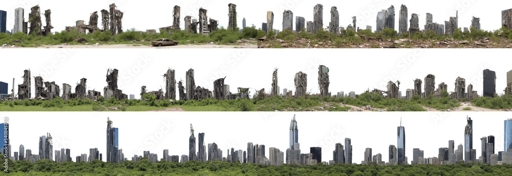 Obraz na plátně post-apocalyptic skyline, ruined skyscrapers, tall overgrown buildings isolated