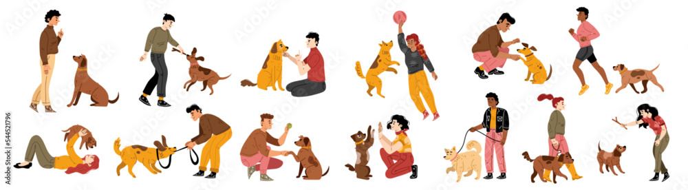 Obraz na plátně Happy people playing with dogs and smiling, flat vector illustration set isolated on white background
