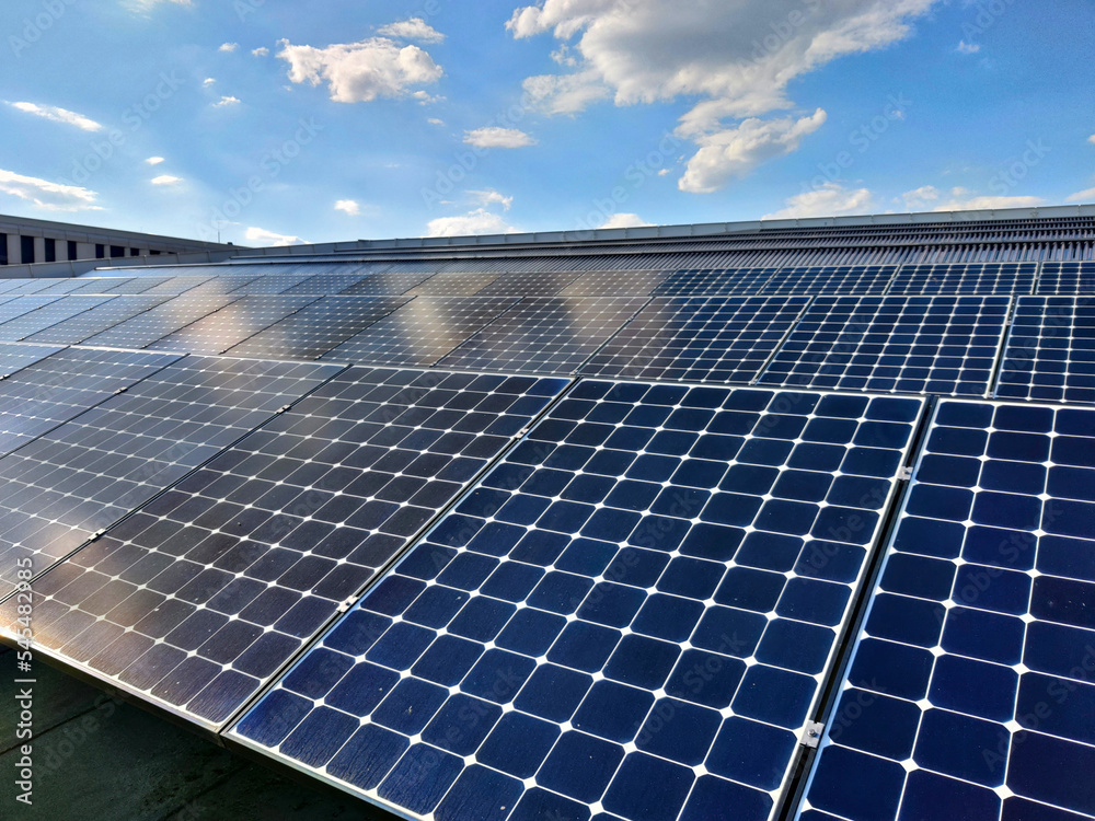 Obraz na plátně Solar panels on the roof of a building during sunny weather