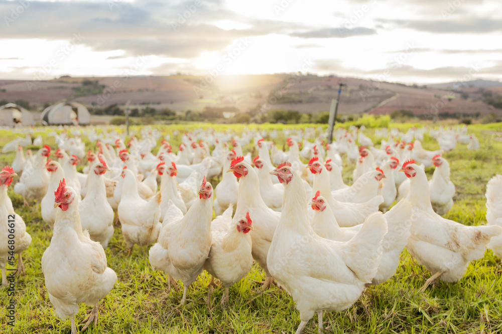 Obraz na plátně Farm, sustainability and chicken flock on farm for organic, poultry and livestock farming