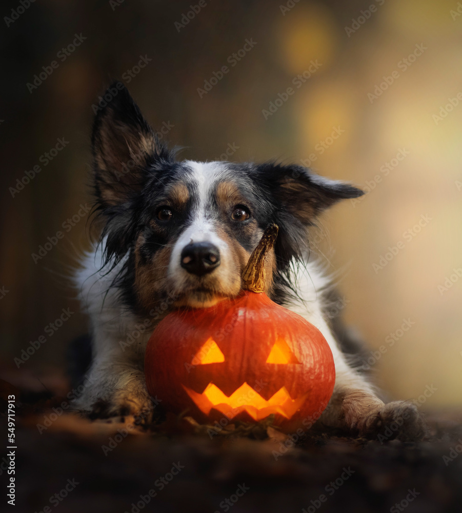 Obraz na plátně Border collie dog lying on halloween pumpkin