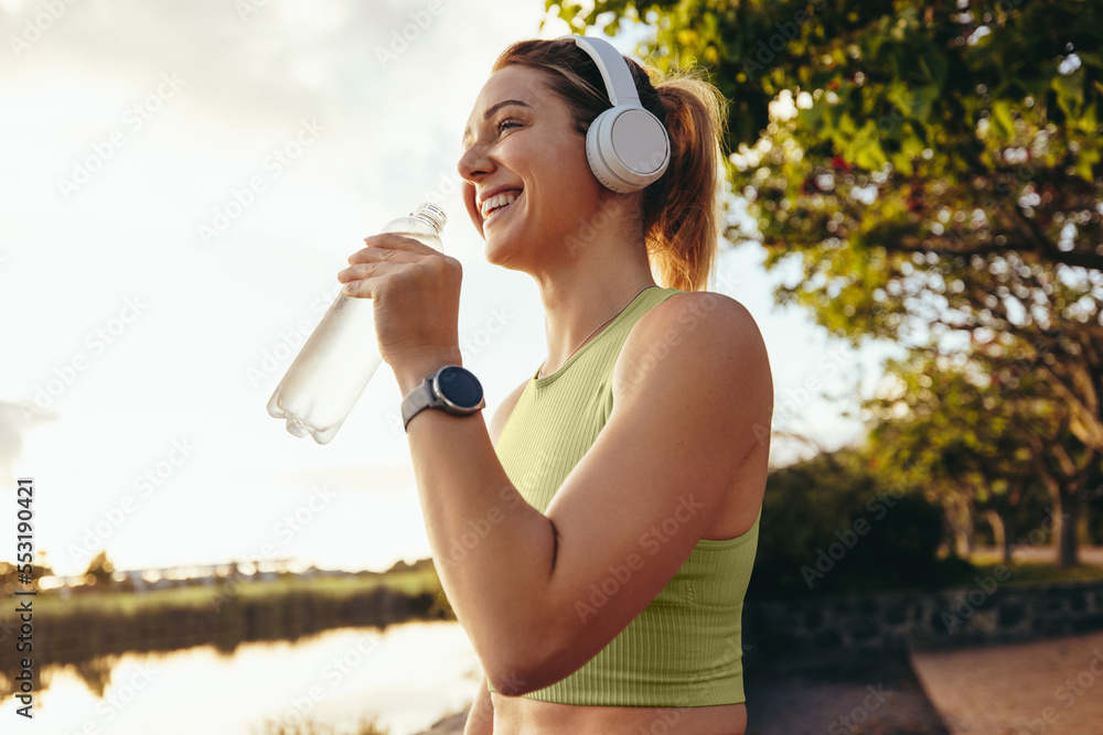 Obraz na plátně Female athlete taking a break outdoors, drinking water and listening to music wi