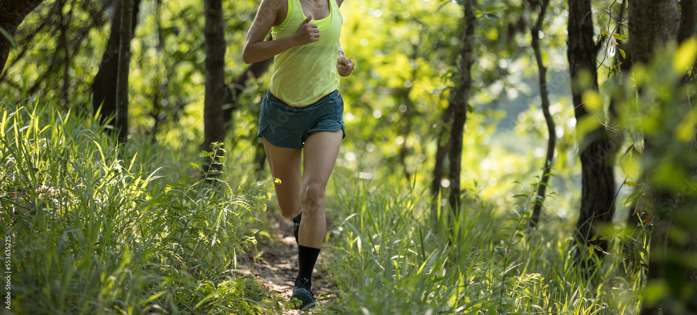 Obraz na plátně Fitness woman trail runner running in summer forest trail