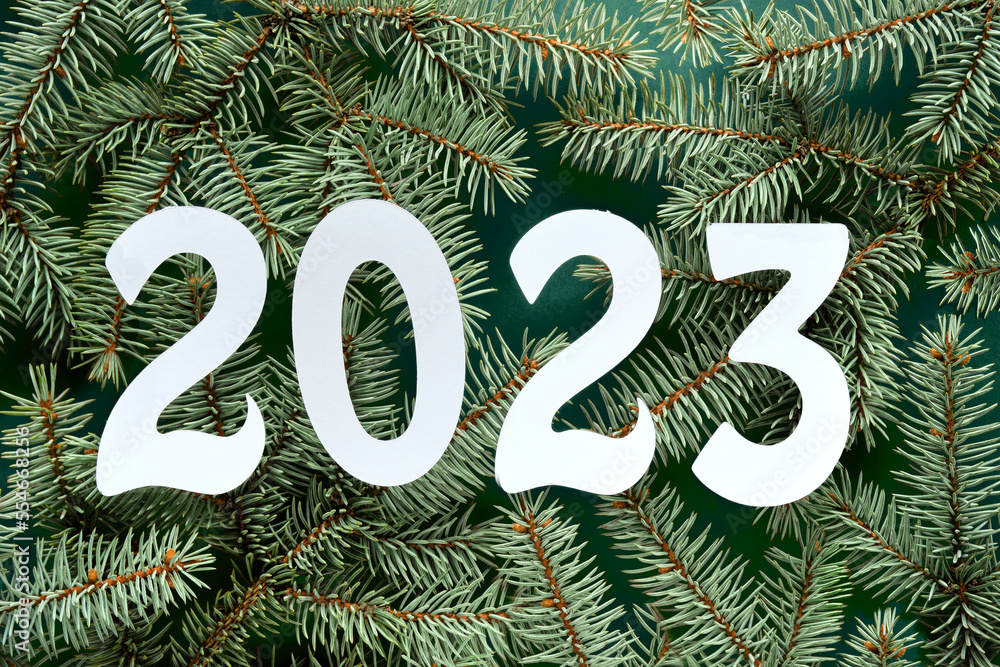 Obraz na plátně New Year 2023, white paper number on fir twigs, green background