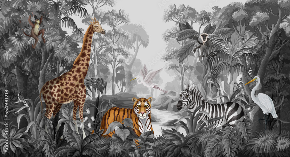 Obraz na plátně Monochrome jungle landscape with wild animals for kids. Vector.