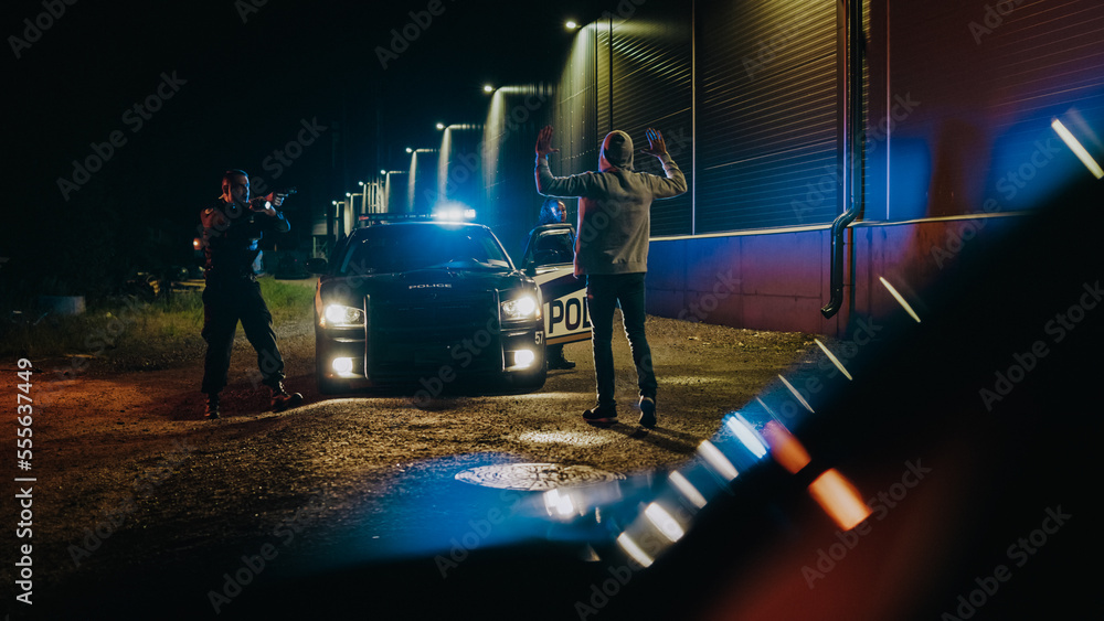 Obraz na plátně Two Police Officers Arrest Suspect, Order Him to Get on the Knees and Hands Back, Cuff Felon